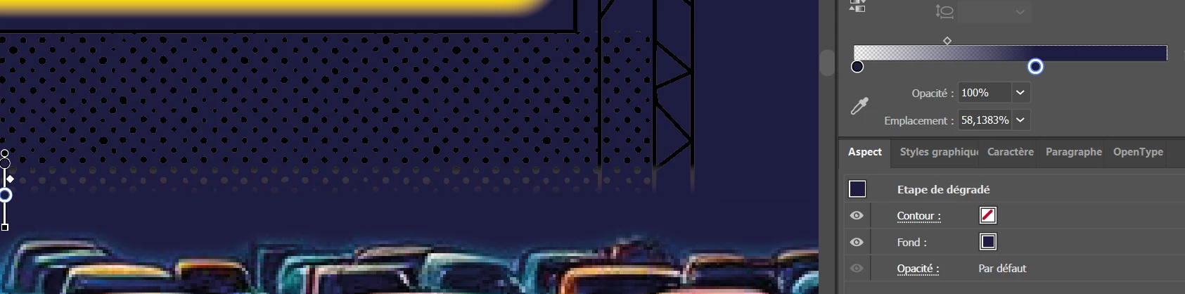afin de cacher un élément noir qui termine brutalement sur mon illustration, je comptais donc mettre un rectangle devant de la meme couleur que le fond et de faire un dégradé entre les deux du Bleu foncé vers un bleu foncé avec une transparence de 0% afin de cacher progressivement le bout du cadre.