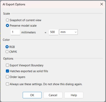 When I try and export as a "Preserved model scaled" rhino drawing, they do not appear on illustrator, there appears to be a blank page with an X. My rhino drawing is located at the origins too. Any tips would be greatly appreciated!