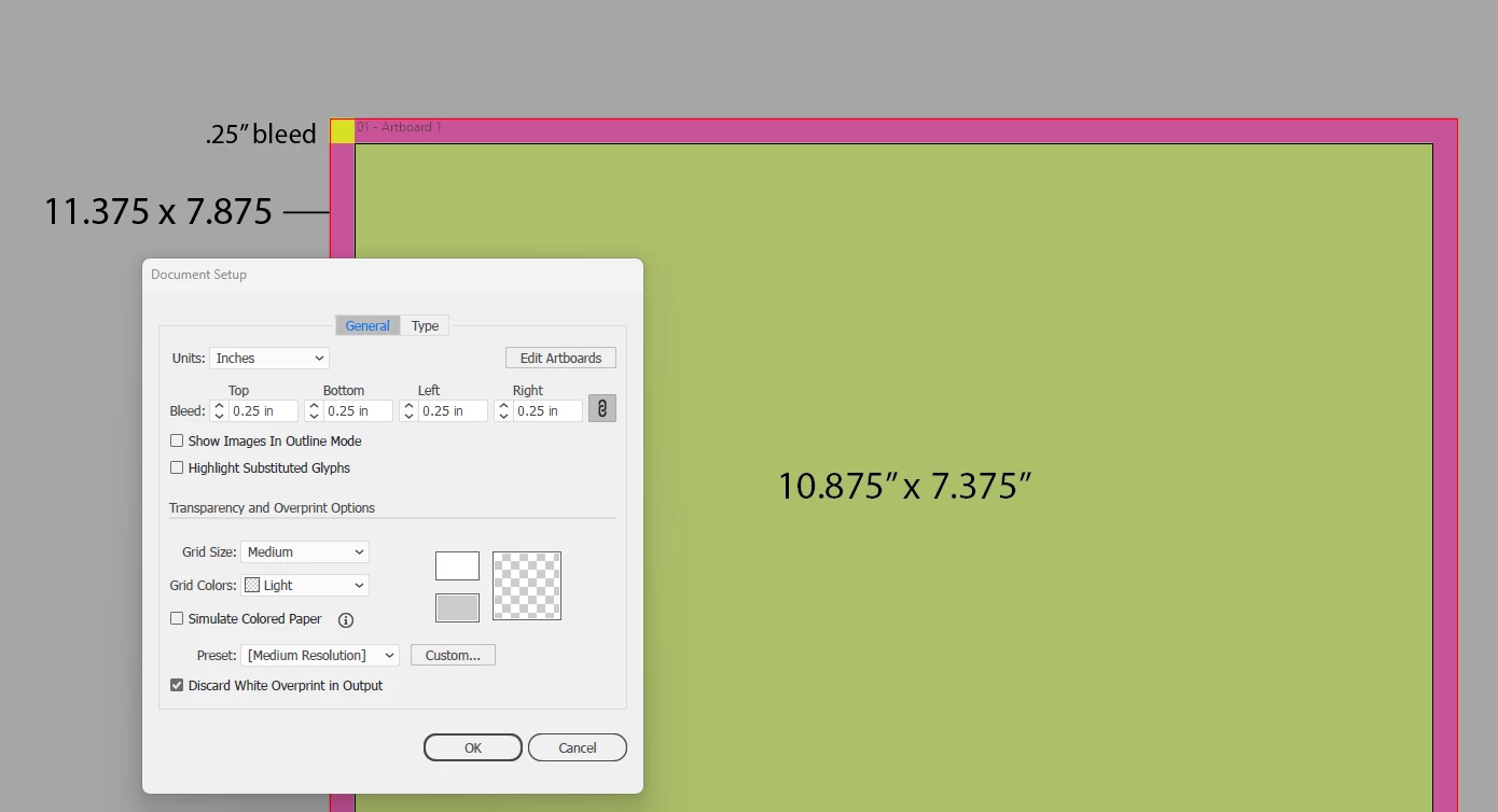 As you can see, the bleed measures .25" but the resulting box is 11.375" x 7.875" meaning .5" has been added