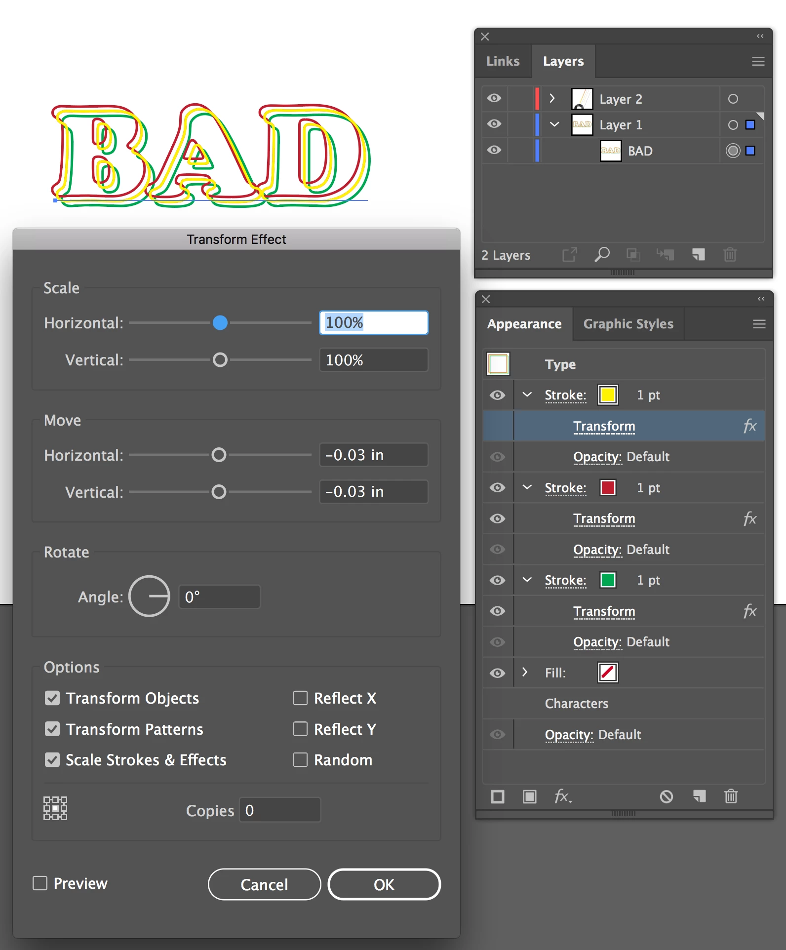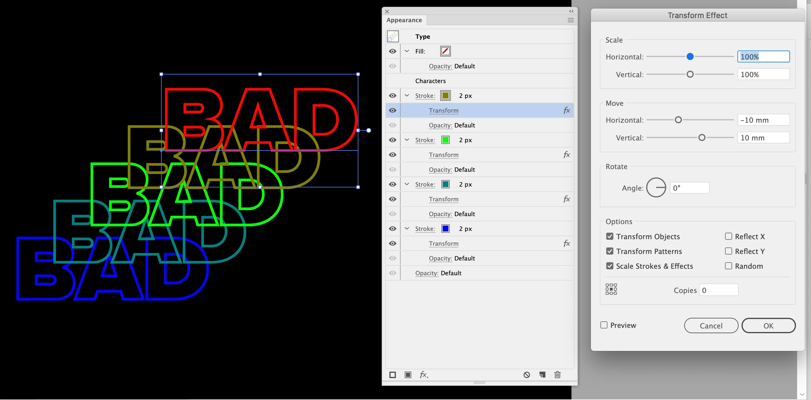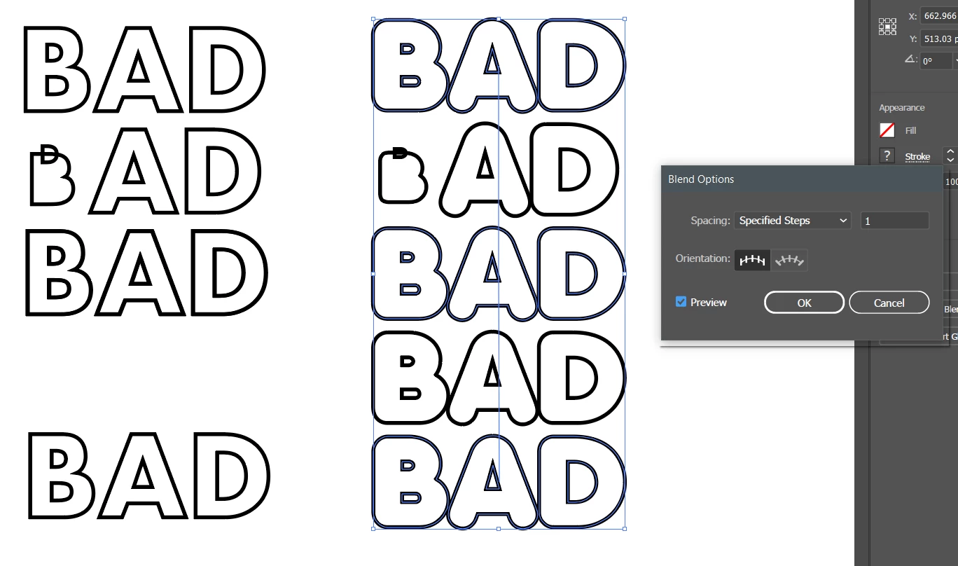 I'm quite new to illustrator and I'm trying to blend between three text outlines. It's acting really strange. Both of these examples have the same blend settings you can see in the right (specified steps: 1). The letter B looks strange, and the one on the left is missing a copy of the word that should be there. I tried this with different fonts but it seems to happen on every one. I'm not sure what to do.