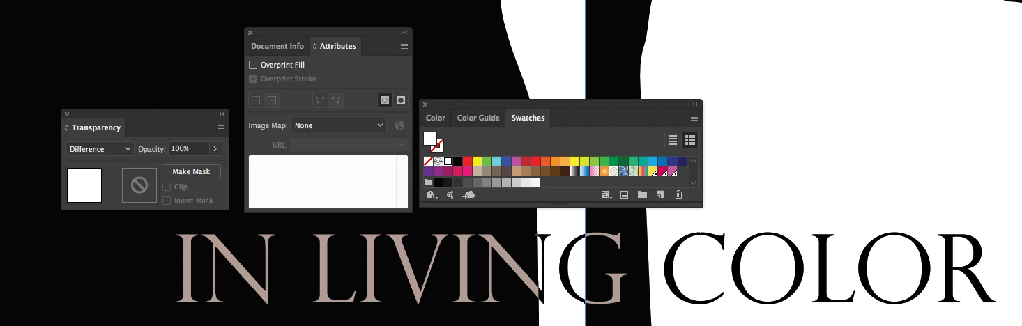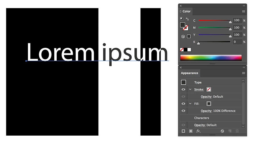 When I use blending mode difference in a CMYK document, the text on black background isn't showing as white. When I convert my doc to RGB, it appears correctly as I attend. How do I make so that the text appears white on black BG. Is it about rich black, etc? Pls see reference below: