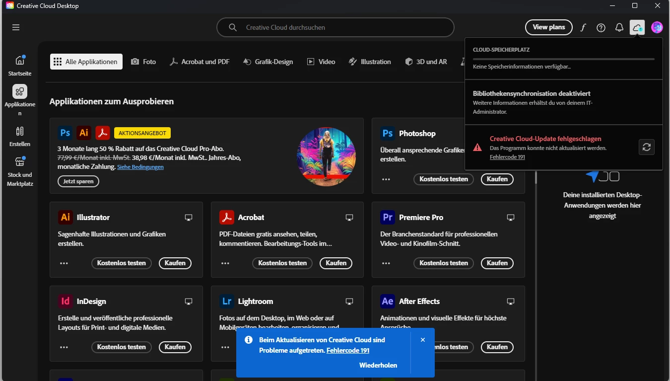 Hello i just bought illustrator from the website and it automatically installed creative cloud but i cant install illustrator. i only can buy it again and im already coonected with my account where i bought it. update isnt working i get the error code 191 and everything i try to do fails because of no connection or connection lost. pls help