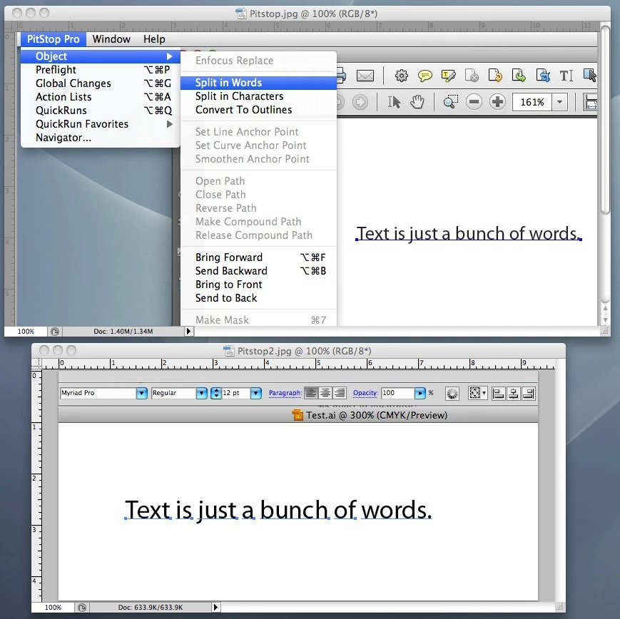Is there any option in illustrator like corel's "break apart" to seperate a text into words or letters?