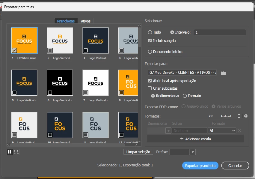 No Adobe Illustrator para Windows, ao usar a ferramenta "Exportar para telas" com a opção "Usar nomes de prancheta" habilitada, a exportação para o formato .AI resulta em arquivos sendo salvos com nomes de prancheta duplicados , como este: