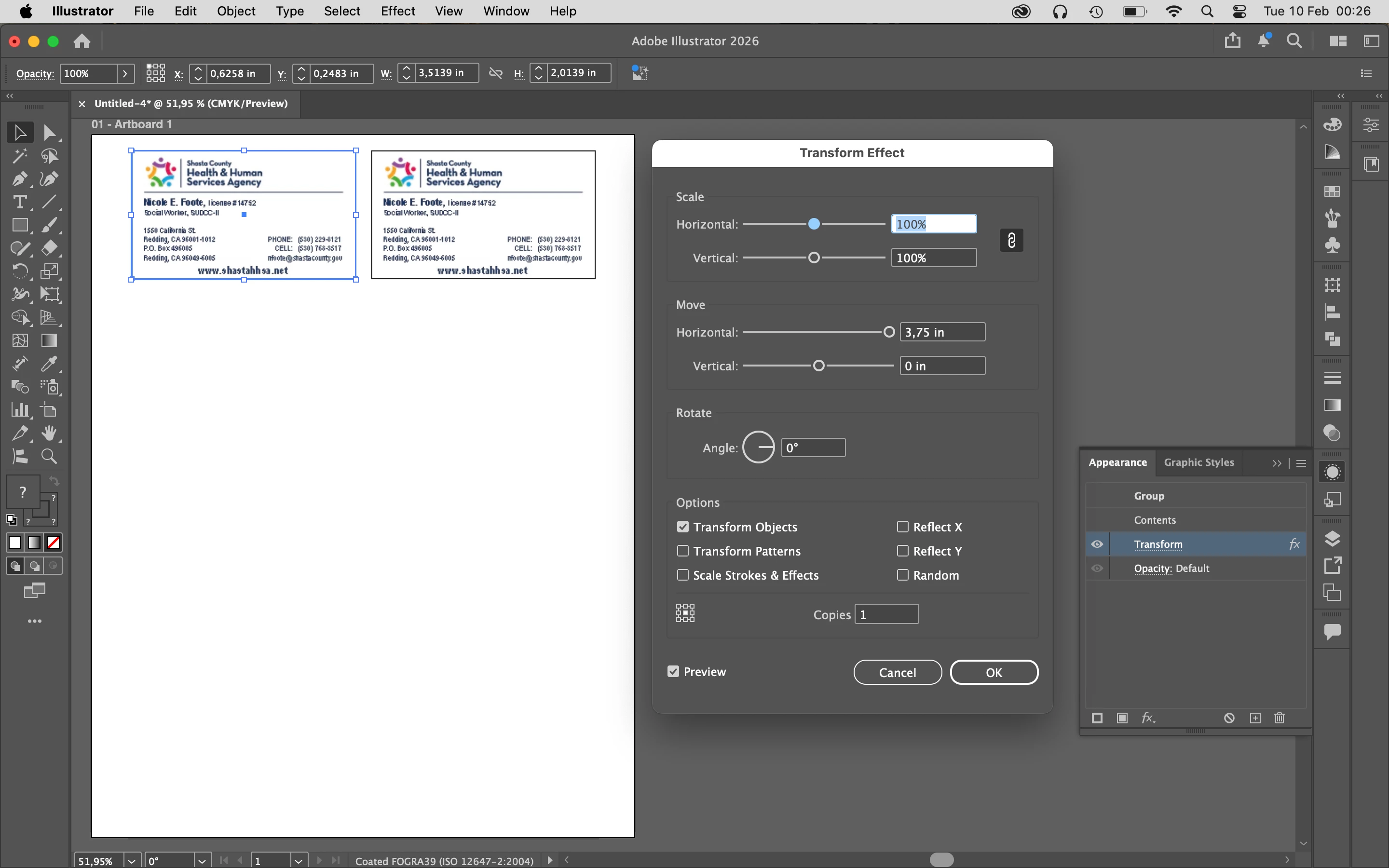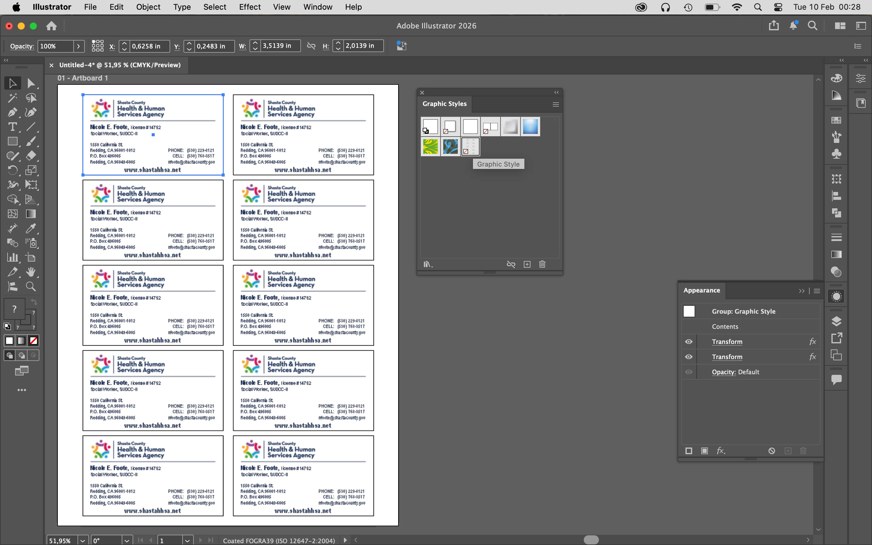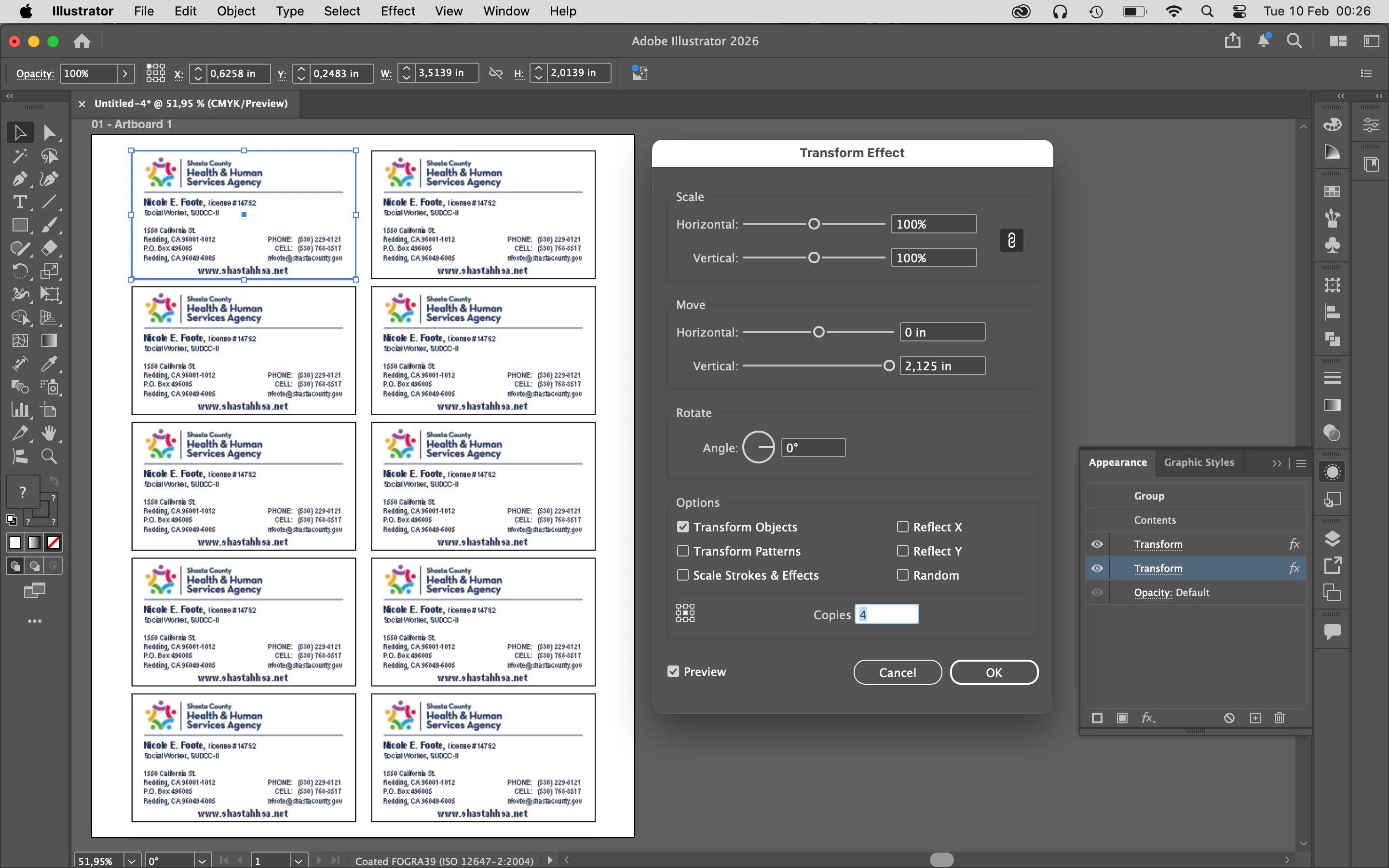 The file is 3.5x2 inches with one business card. When printing, I select “multiple copies per sheet” and “10 copies.” It looks like this: