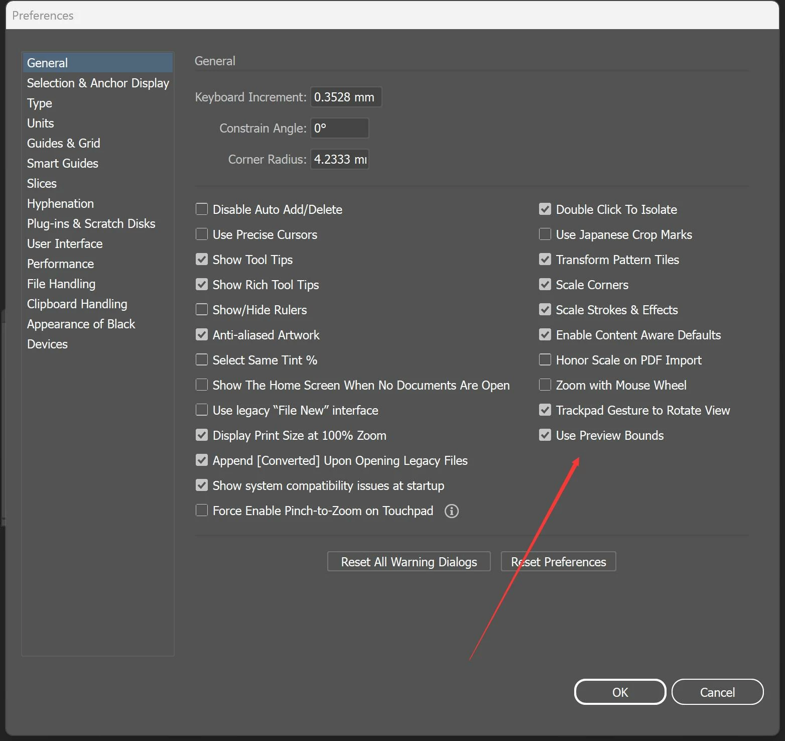 Can Illustrator scripts get whether the preference "use preview bounds" is checked or not?