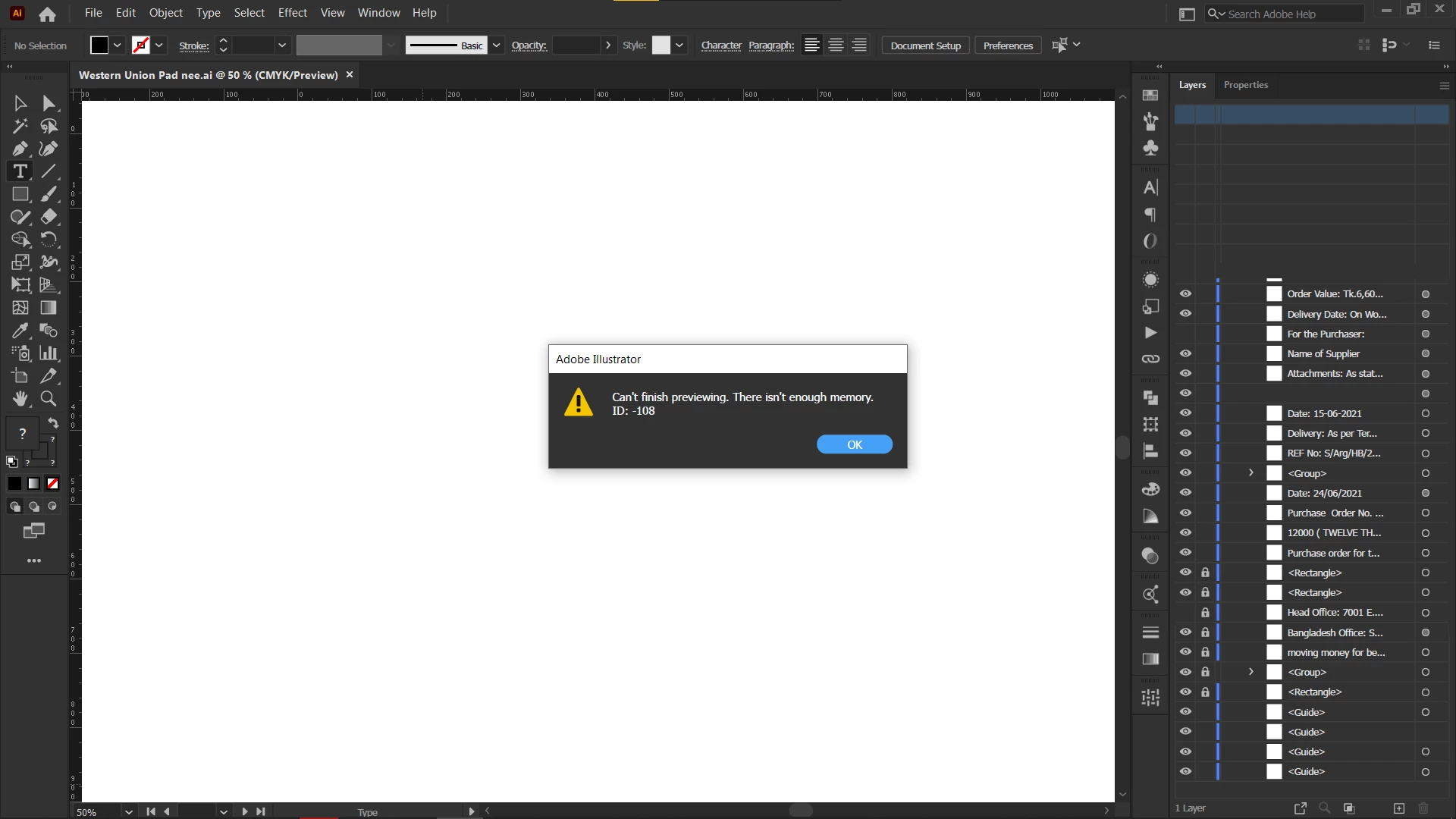 One of our clients sent us a file that they would like printed. The file is 1MB in size, and in PDF format - nothing unusual about any of this. As usual, I saved the file and tried to open it in Illustrator to set up a proof for our customer, and to check and make sure the file is print-ready. I received the error: "Can't finish previewing. There isn't enough memory. ID = -108". I press OK and it opens up a blank file with some crop marks on it.