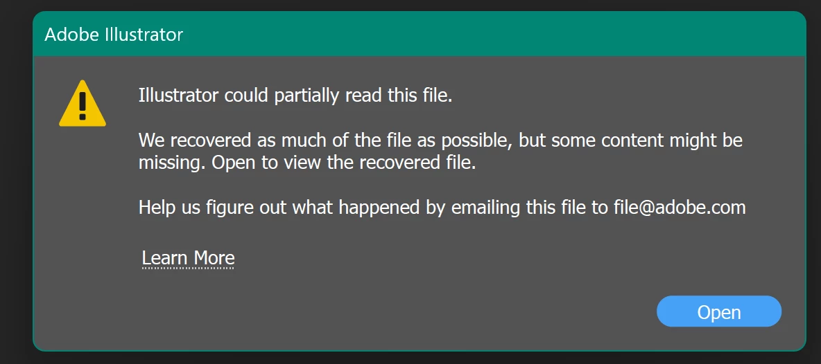 I'm trying to open an existing file in Illustrator, but I'm getting an error message every time.
