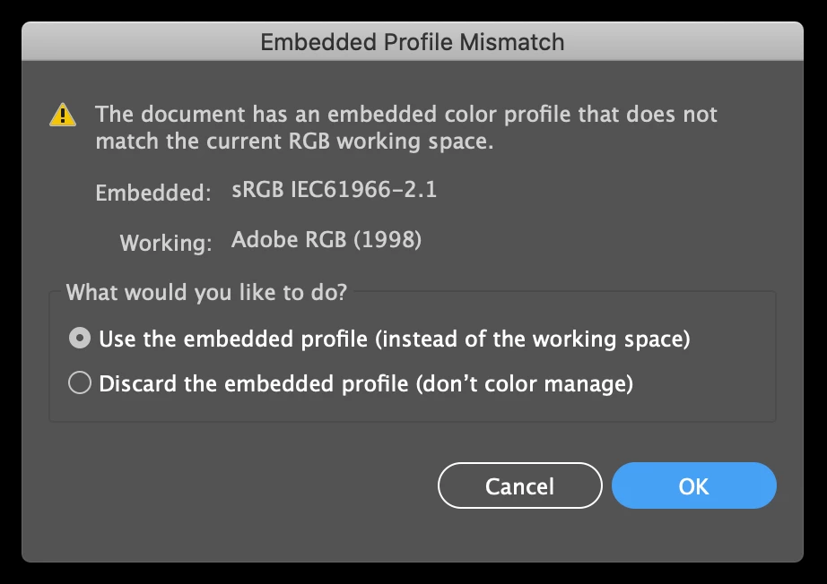 Sometimes, when this window pops up, no matter which option I choose, I can't open the file. The same window keeps popping right back up instead. I could choose "use embedded profile" or "discard" a thousand times, and I still can't open my file.
