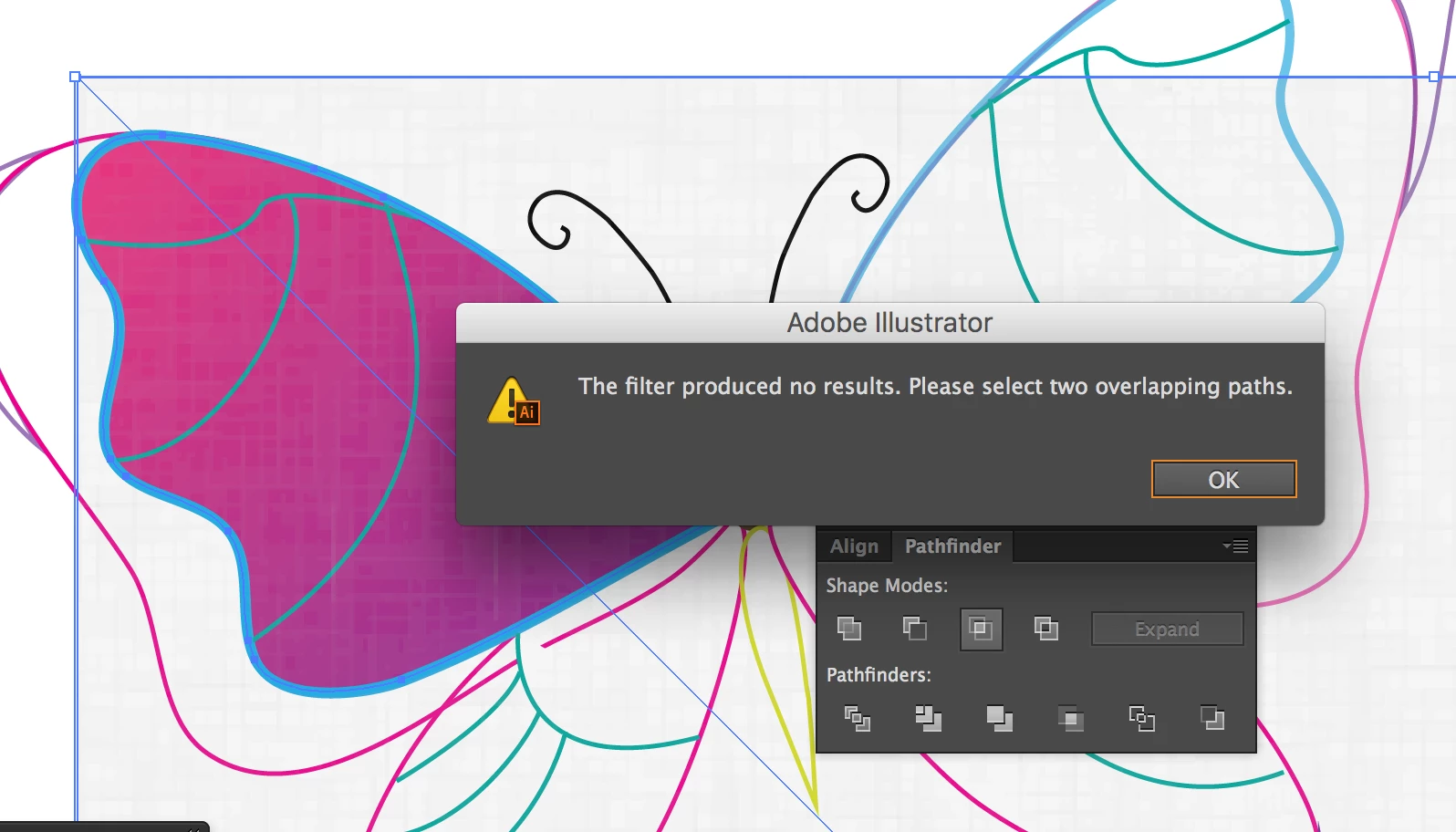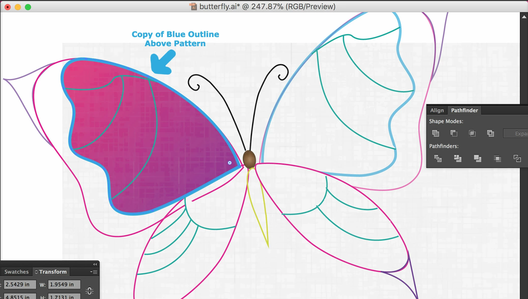 So I'm trying to create a butterfly and I want to include a pattern I added using "Place" to only one wing. I'm trying to use pathfinder to do this but it won't work.