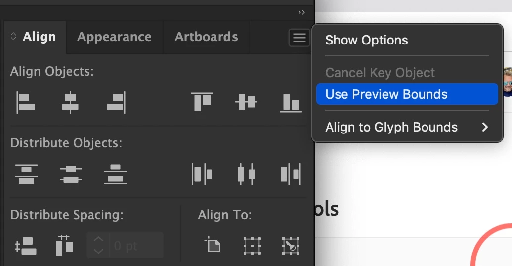 Recently got a new laptop and am trying to configure illustrator as it was on my PC. Before I used to be able to go to Windows > Align > and scroll down to tick preview bounds on. But now the option is gone with only scale corners and scale effects remaining. Has it been moved?
