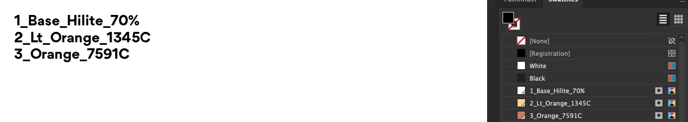 So for example "1_Base_Hilite_70%" I would like this line of text to be coloured with the appropriate spot colour swatch with the same name and so on.