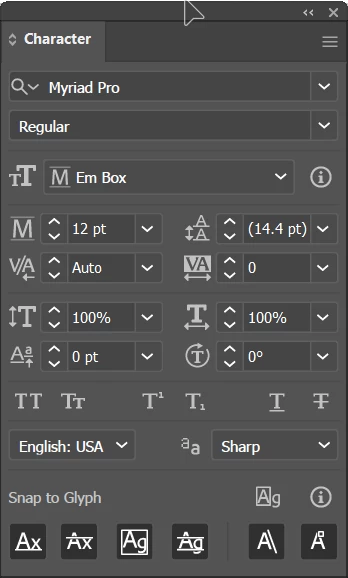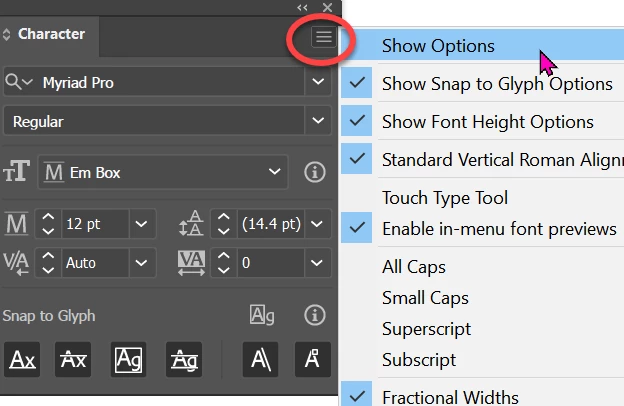 Hello. Does anyone know why the Character Panel has recently stopped including Horizontal Scale, Vertical Scale, Baseline Shift and Character Rotation? (not to mention Rotate, Underline and Strikethrough. Mine just stops after Tracking).
