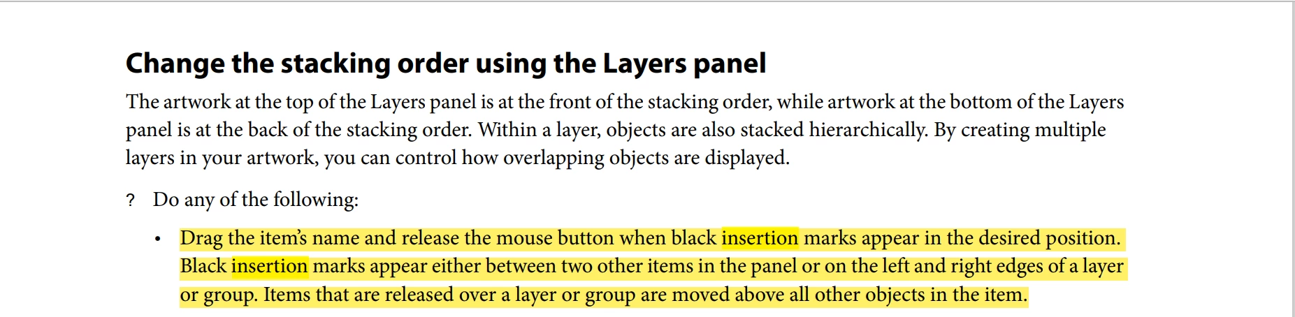 I read in the Adobe Illustrator reference guide that when you drag an item between two other items in the layers panel, black insertion marks appear between them or on the left or right edges of a layer or group. I have two questions regarding this: