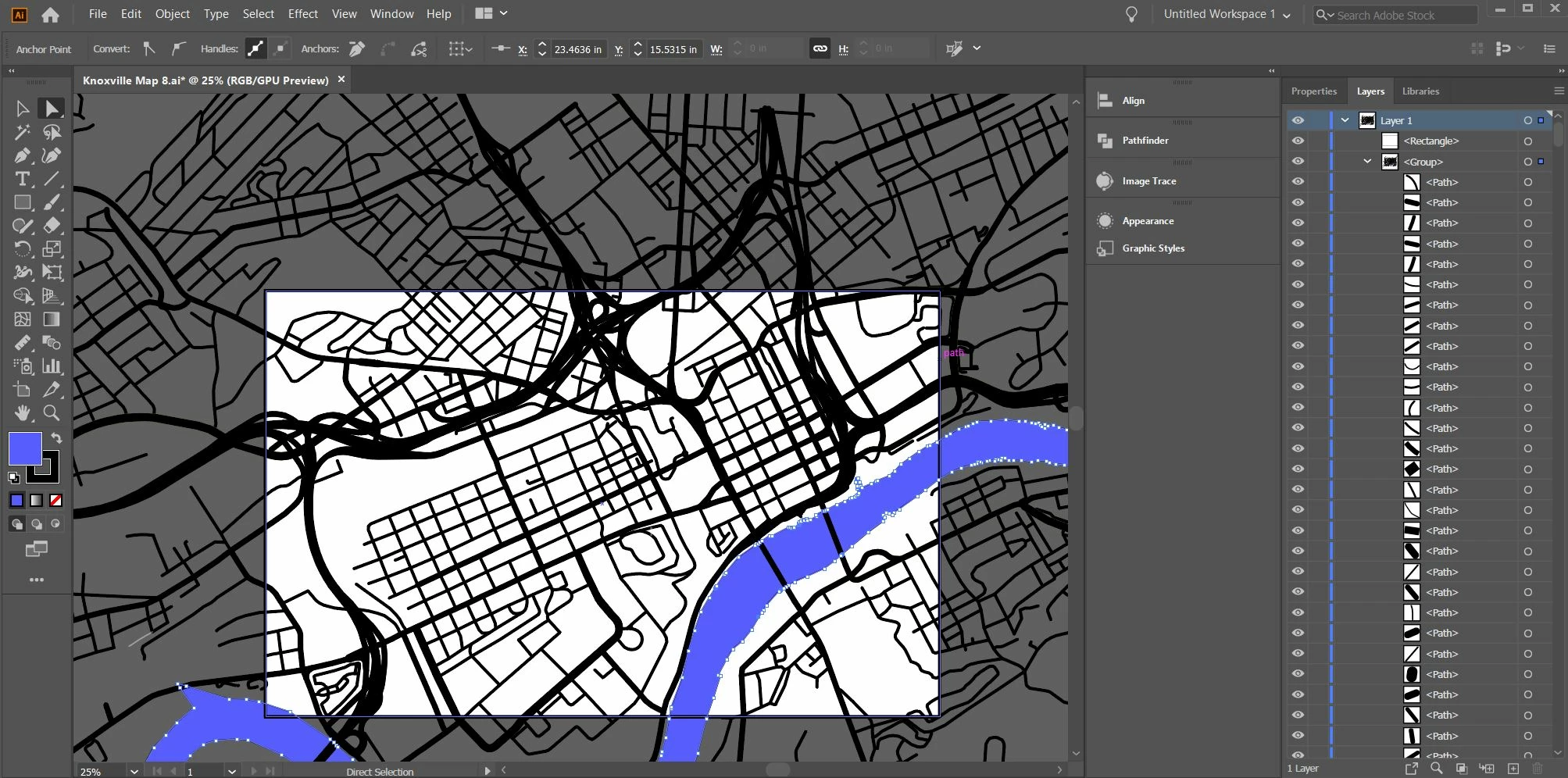 Hey creative people. I'm hoping you can help me with an issue that has taken up a couple hours of my time and my usual presusing through youtube videos can't help me figure out. Has to do with clipping masks. I have this image of a map that I've been working with and I'm trying to crop the current map to a smaller (or zoomed in) size. The best way that I've heard to do this is with a clipping mask which you can see I'm in the process of applying here. These are all paths along with a compound shape (the river) in the areas I'm trying to crop.