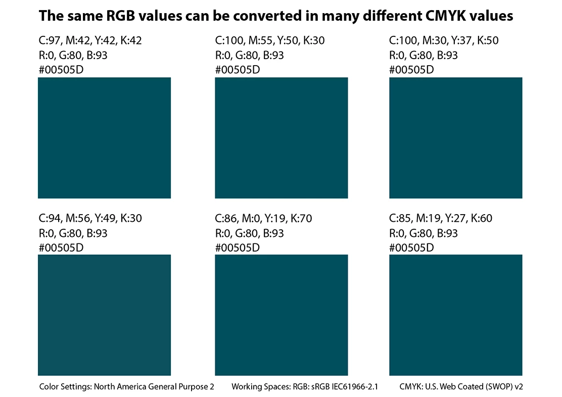 Thank you for illustrating the different CMYK values a RGB can be converted to, depending on the profile.