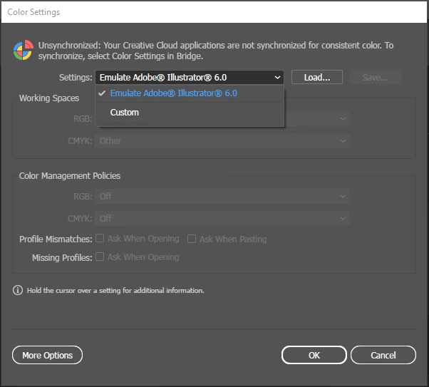 Color settings in Illustrator: Common settings unavailable to me