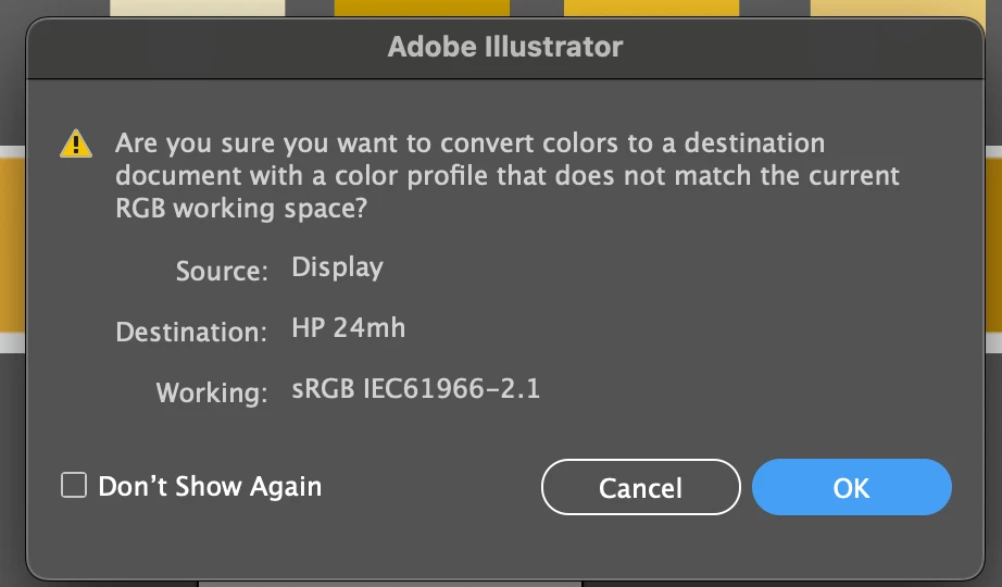 I am taking a vector that was built in RGB color mode and pasting it into a new document with RGB color mode applied. The color profile settings are also exactly the same between both files. Anyone know why would this alert would come up?