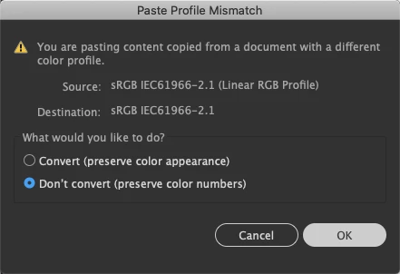 When I copy something from another document into this one with the color problems, I get a warning that could indicate what's happening.