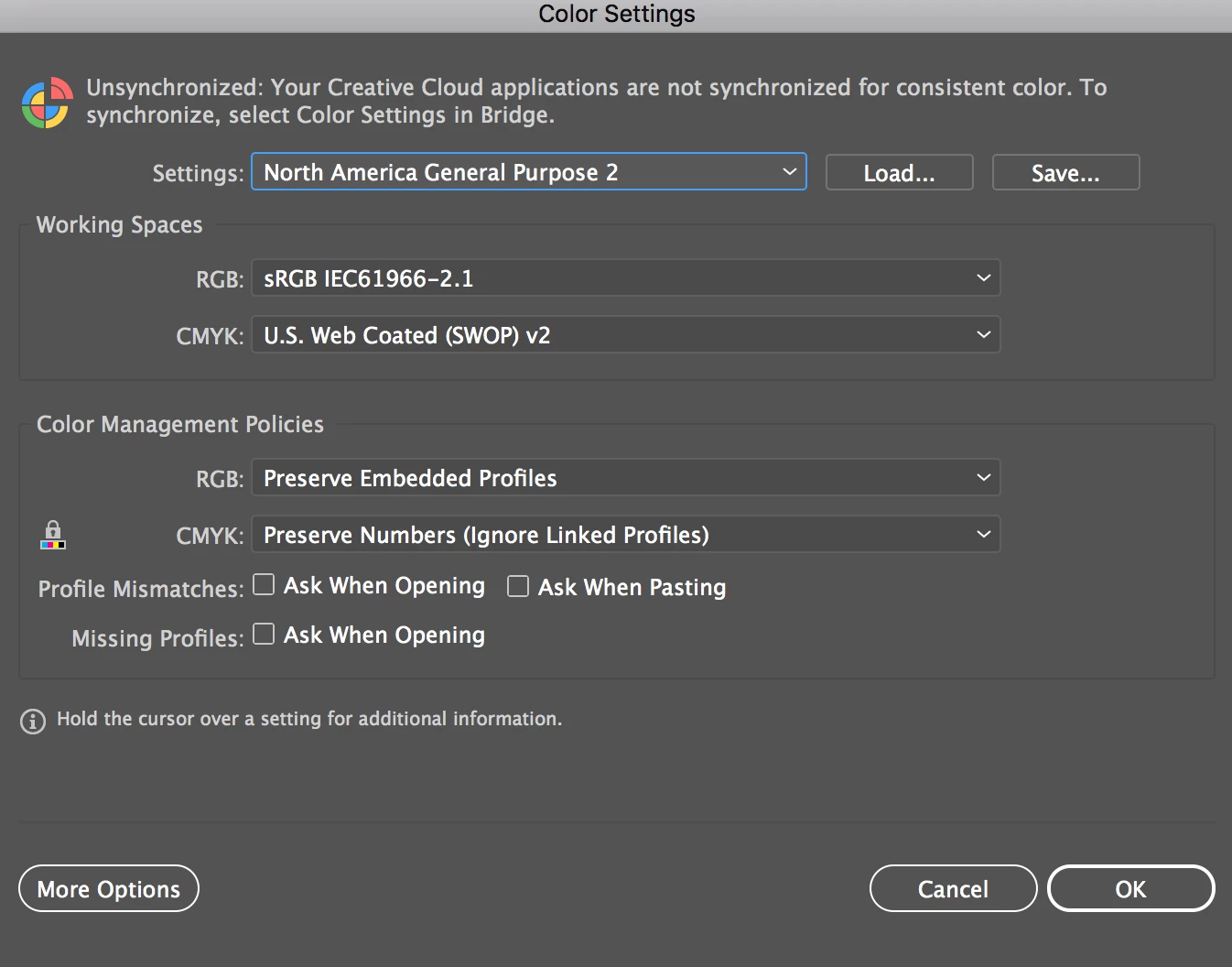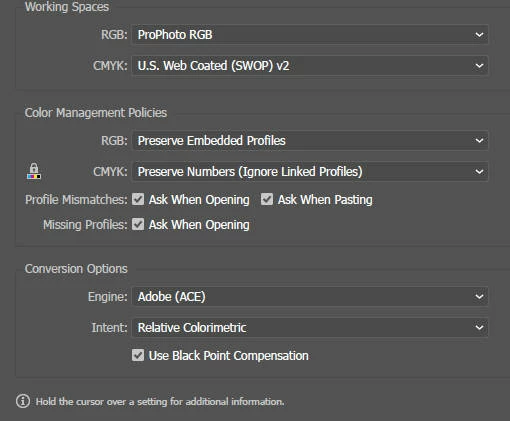 Colour management settings are synced as follows: