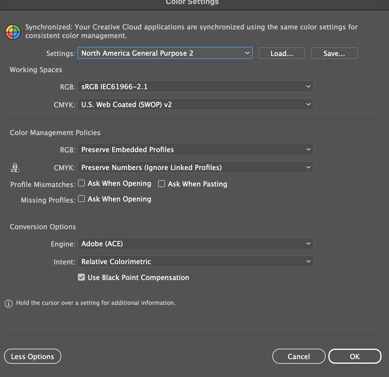 These are my colour settings in Illustrator: