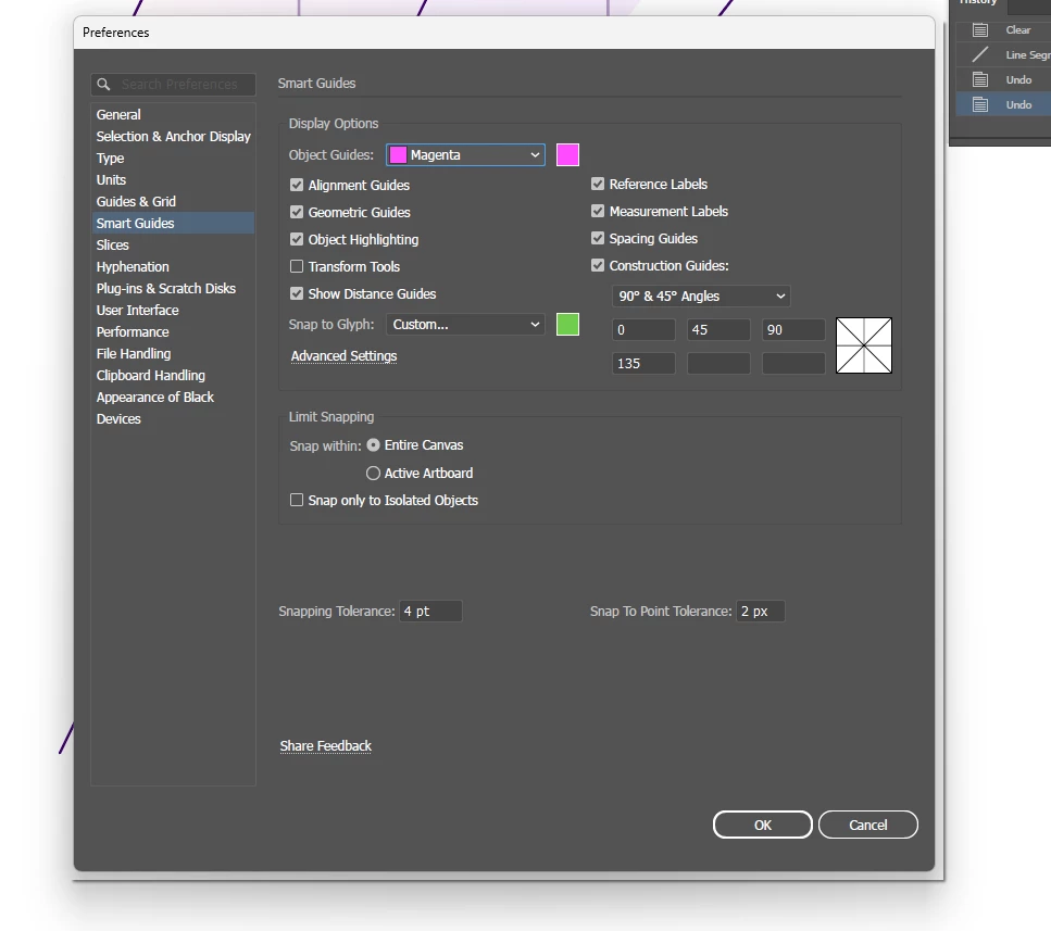 Como eu faço para a referência de interseção aparecer no Illustrator?