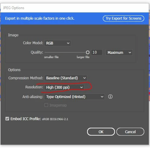 I'm creating a t-shirt design using Illustrator. Once I convert the .ai file to jpg, the T-Shirt design interface says the image is poor quality. How to I ensure that the image is high quality? I understand the benefit of using vector but how do I translate that when I export.