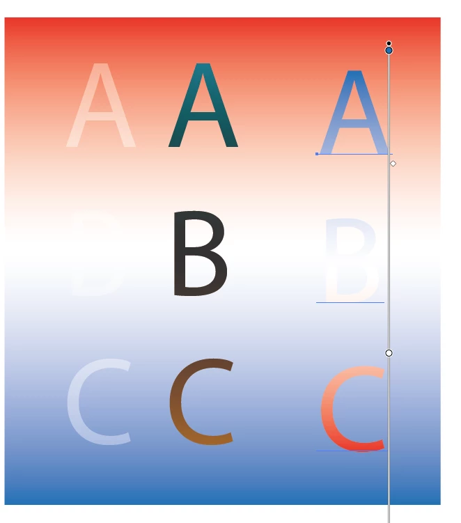 In Illustrator CC 2020, I am trying to create an inverse color for text that is in a layer in front of a layer that has a gradient fill of red, white, and blue. The purpose is to make the text stand out more clearly, depending on what part of the gradient the characters of text are. How can I do this?