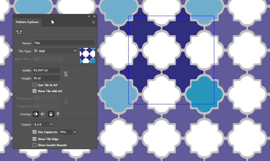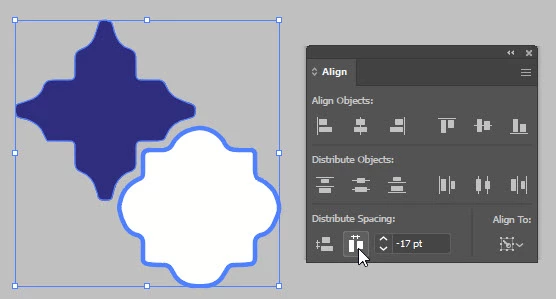 Select these objects and go to Object > Pattern > Make. Use the Tile Type called Grid. Make sure Move Tile with Art is selected and in the Width and Height fields, enter the amount behind the current value. In this case, I use -17 pts for the vertical space, so after the width of 83.1647 pt, I'd type in -17. Illustrator will do the math for me. Do the same thing with your value for the height. Click Done when your pattern looks good to you. Then you can draw out a rectangle and apply the pattern from the Swatches panel.