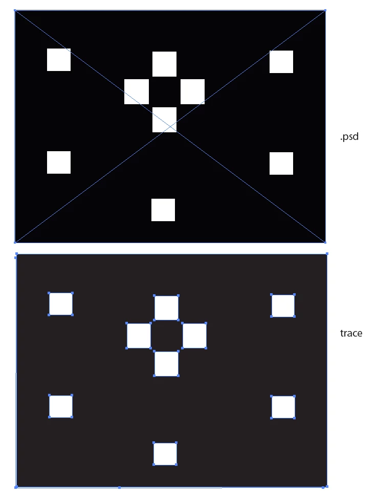 The image above is a Photoshop file and the image right below it is an illustrator file. My goal is the match the illustrator file as closely as I can with the Photoshop file using image trace with only the settings used in image trace without having to redo the whole image (or at least having as few misshapes in the file as possible that I can fix later). My issues in illustrator is the after effect of using image trace, there is another blob or rounded shaped color around or inside the squares. I don't mine fixing and repairing a few, however I want to be able to correct the squares and shapes as closely to the Photoshop version as possible. I am currently using illustrator 2024 version, Thanks in advance!