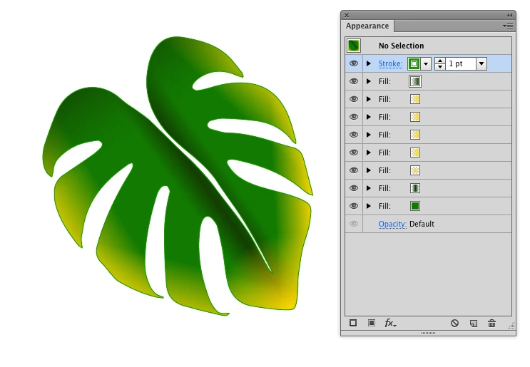 I am trying to apply multiple gradients to a leaf, or to any other object for that matter. Along the protruding edges I would like to apply a short gradient that points inward. I would like to repeat this gradient to every protruded edge, but each gradient would have to be manipulated independently. I have tried to do this using the Appearance Panel, by duplicating the fill. This works just fine but because the gradients are on different layers I can only see one gradient at a time, no way to see them all together.