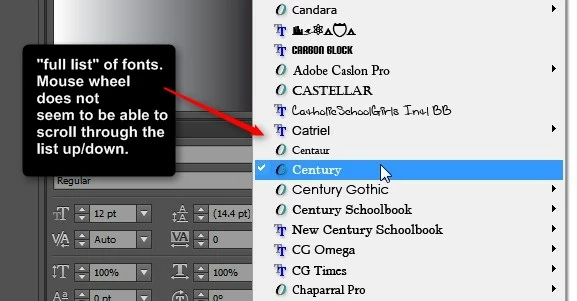 While I do love and use the feature, I still often like to pull up the "full drop down list" of fonts like I've previously mentioned and use the mouse wheel to scroll through the list quickly. This enables me to see many fonts at once, instead of just a single one at a time. But again, this is where the mouse scroll wheel does not seem to scroll the list. I was able to scroll though the list in older versions of Illustrator CS.