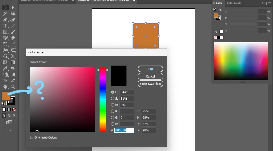 Custom colour swatches shows black in colour picker box.