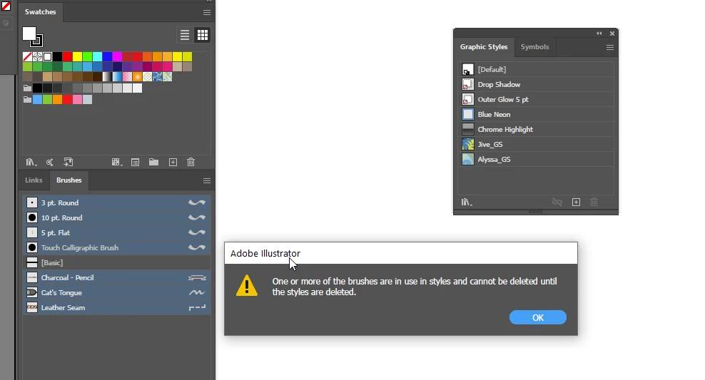 "One of more of the brushes are in use in styles and cannot be deleted until the styles are deleted."
