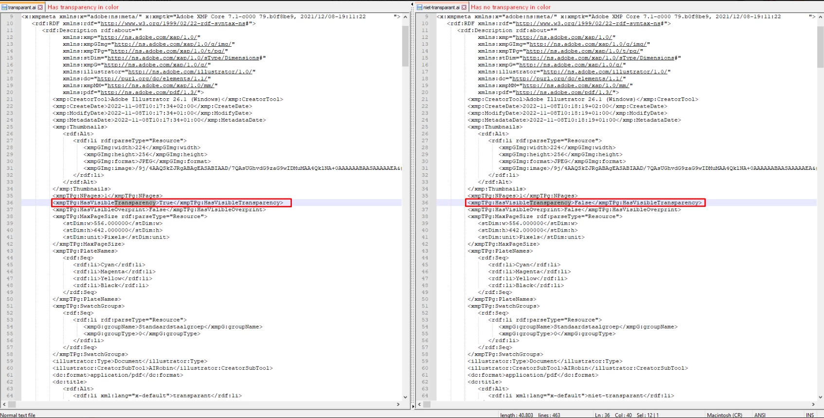 I have made 2 same vectors one has transparency the other one doesn't. I see that in the file that has no transparency the 'HasVisibleTransparency' is false. Does someone have documentation or know more about this subject?