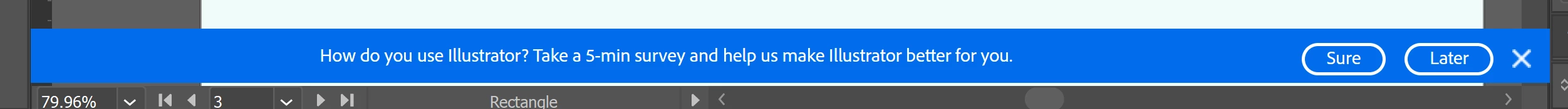 For the past few days a stupid little survey notification has been popping up in Illustrator, sometimes more than once a day. I've clicked X, "Later", and yesterday I took it (really repetitive, btw) hoping it would get rid of the notification for good, only to have it appear again today.