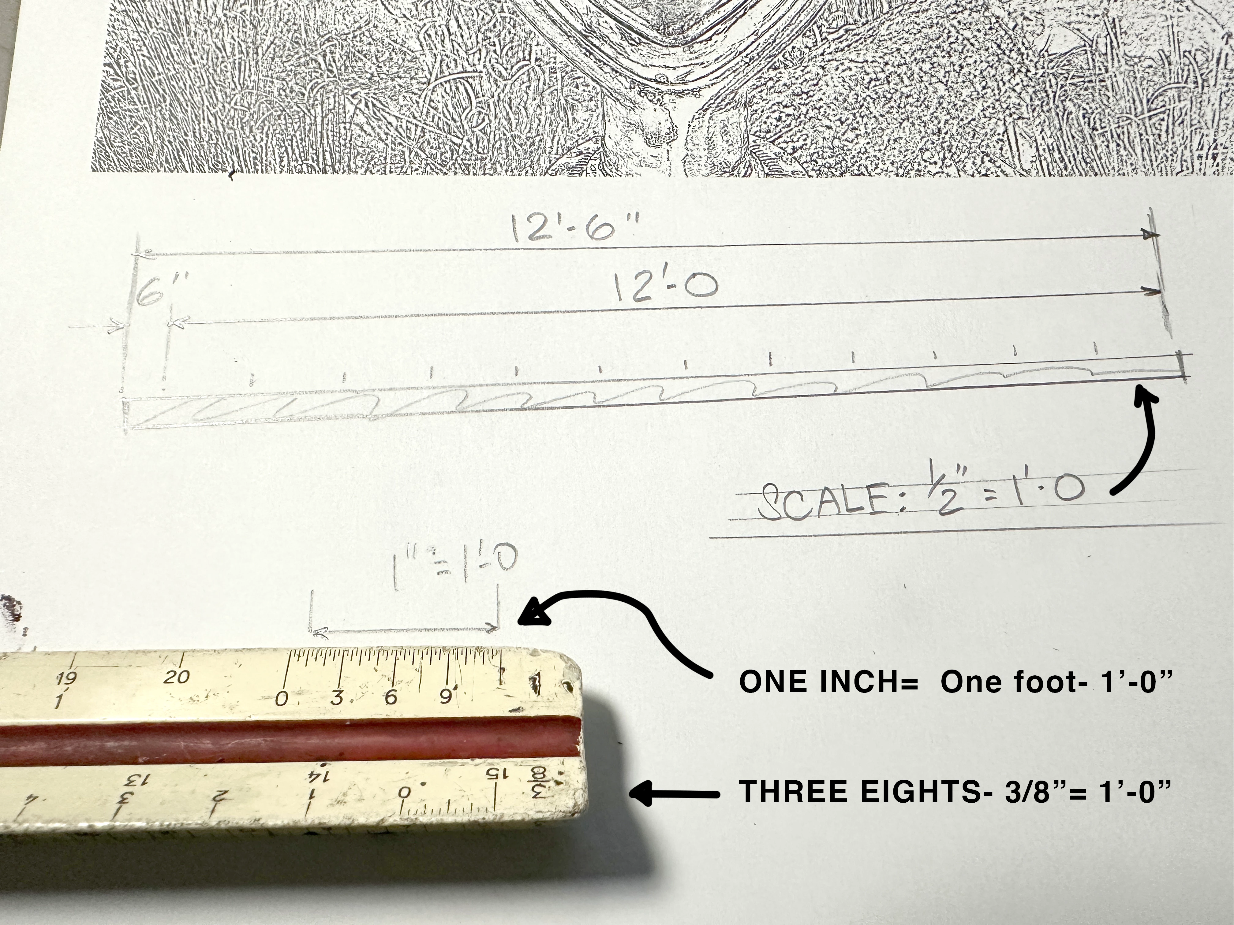 Does Illustrator have architectural rules and the ability to scale measurements? To lay out wood or structural plans, we use an architectural scale (ruler) which breaks down an inch (English Unit) to 12 parts representing 12inches to a foot. On the same ruler, to draw a large object to fit on a paper plan (like a deck), the ruler has the option of breaking down an inch into halves, quarters, eighths, etc., each of which has 12 marks representing inches. It would be impossible to draw a 12-foot deck on a piece of copy paper, but if we use an architectural half-inch equals a foot scale, 12 feet will fit.