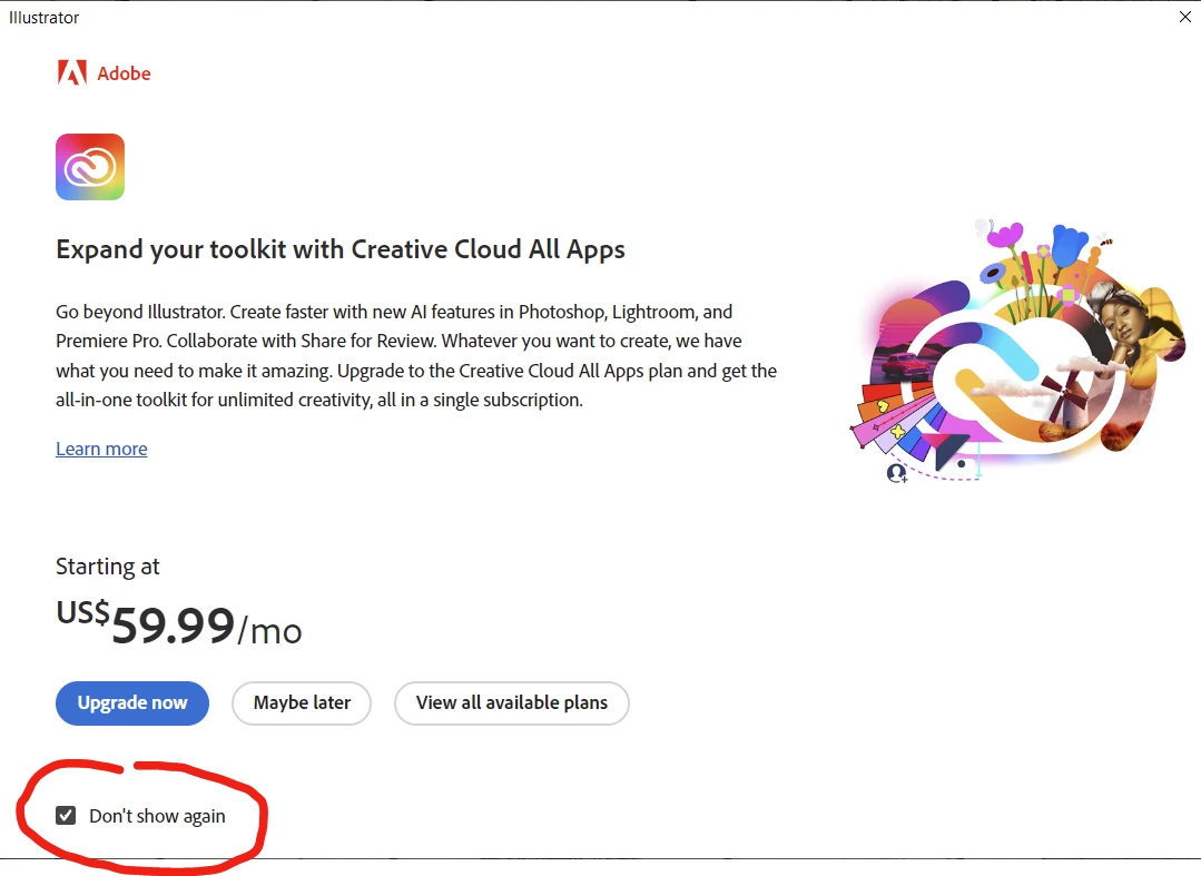 What I would like to have happen is: I would like to start Illustrator and not see this offer. To me, that's what the "Don't Show Again" box would seem to indicate. What would Adobe suggest I do in order to not see this box again?