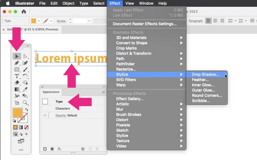 Trying to add drop shadow to text in Illustrator. However when I click Effect / Stylize... the drop shadow option is greyed out. I have tried different fonts but same result. Help?!