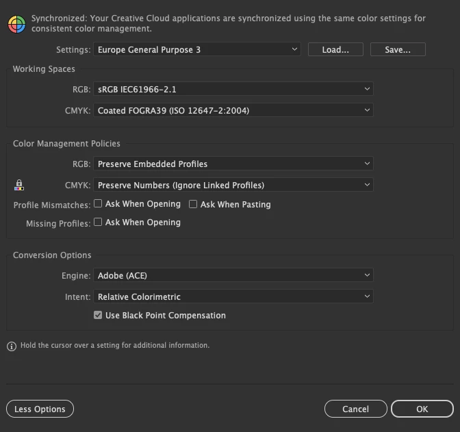 - Changing Colour Settings from my usual Europe General Purpose 3 to determine any difference (in anycase Photoshop shows correctly in CMYK mode under the same Europe General Purpose 3)