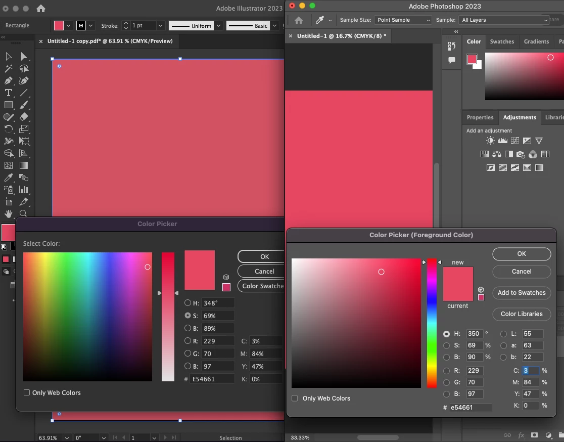 - On the same laptop with side by side windows running Photoshop / Affinity replicating the same CMYK swatch in the same color mode (which shows correctly in Photoshop / Affinity)