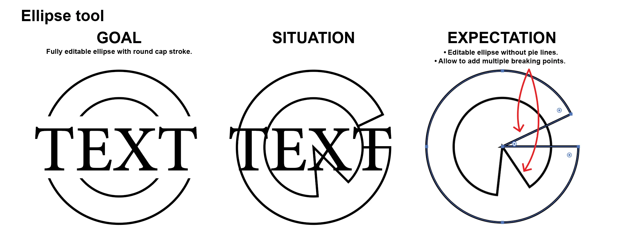 Illustrator 29.5.1, on macbook pro M2: I am having issue with ellipse tool... i work on logos a lot and it would be better if you can give user more flexibleity to add breaking points and withouth have the pie lines in the center.