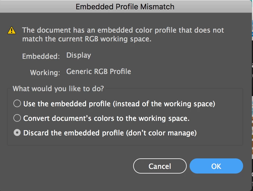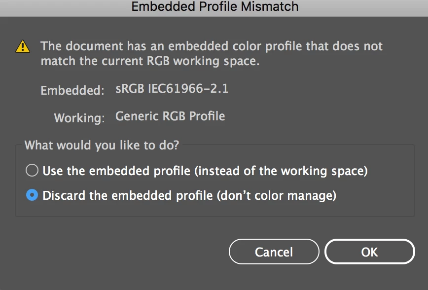 If you chose the first option for either of these, the file will open just fine using the embedded profile.