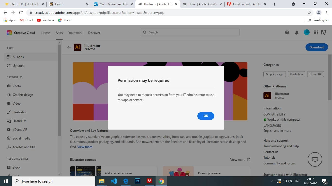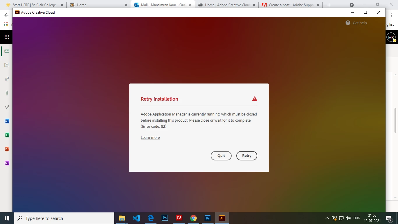 MMansimran5C3AParticipantForum|Forum|4 years agoJuly 12, 2021QuestionError 82Forum|Forum|4 years agoJuly 12, 20211 reply341 viewsHello Sir,I am facing problem for downloading adole illustrator as it is showing Error 82 when I start to install.I am attaching the screenshots of this issue. Please guide me to install these apps as soon as possible. How to