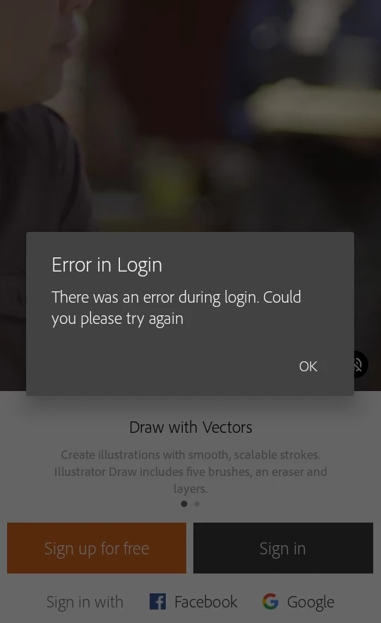 Hy , When I sign in with Adobe Illustrator Draw App this error message keeps on popping up.  Anyone with idea to fix it please assist. Thanks