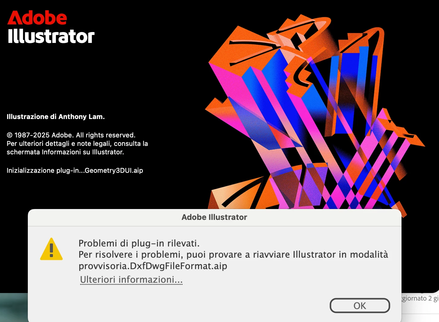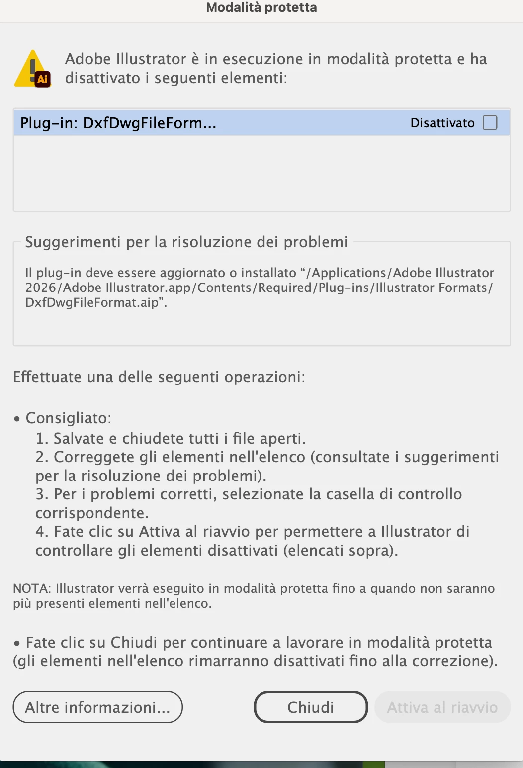 I tried to upgrade Illustrator on a Mac Studio 2023 with Sequoia 15.6, from v29.8.1 to the latest v30.0, but immediately after the splash screen, a window appeared saying "Plug-in issues detected." It warned me that the program will run in protected mode and that the "DxfDwgFileFormat.aip" plug-in had been disabled. The suggestions advised me to update or install it, indicating the folder.
