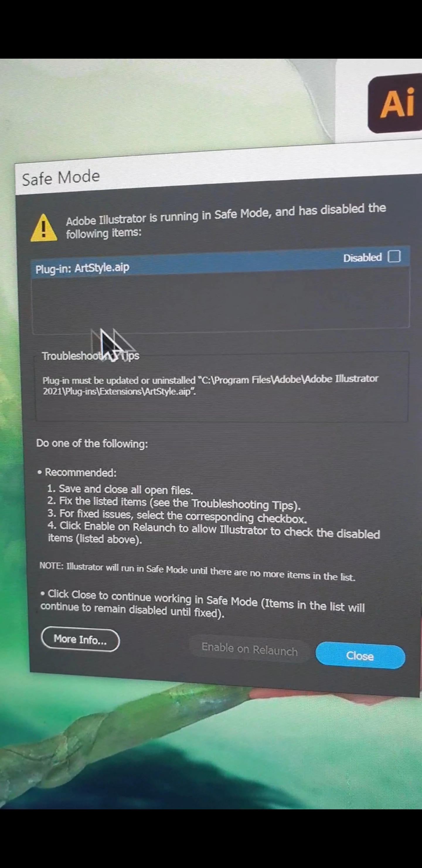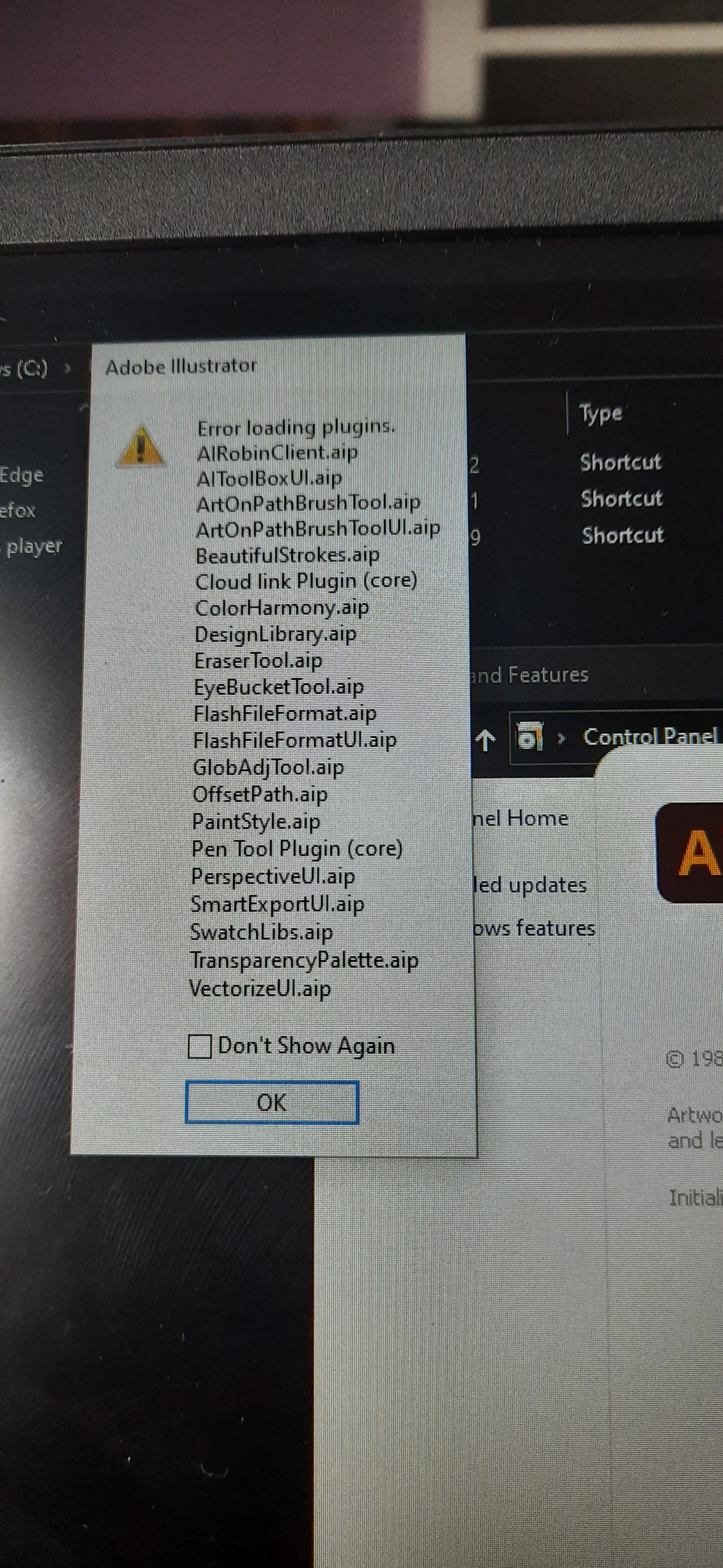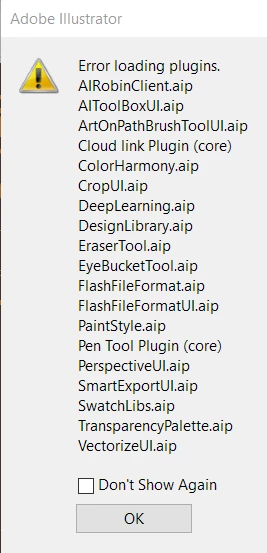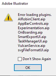 Error loading plugins/ Missing Plugins while launching Illustrator on Windows machine.