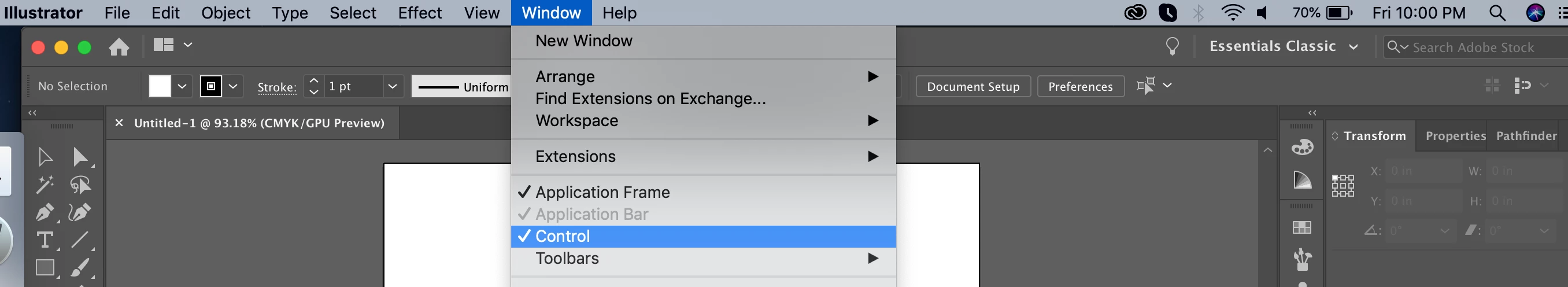 For Control Panel, did you try from Window -> Control. See attached screenshot. This option must be checked.