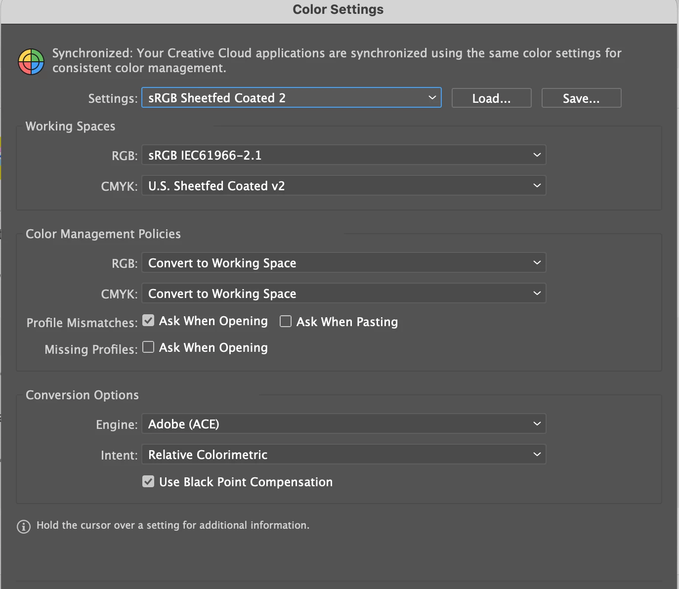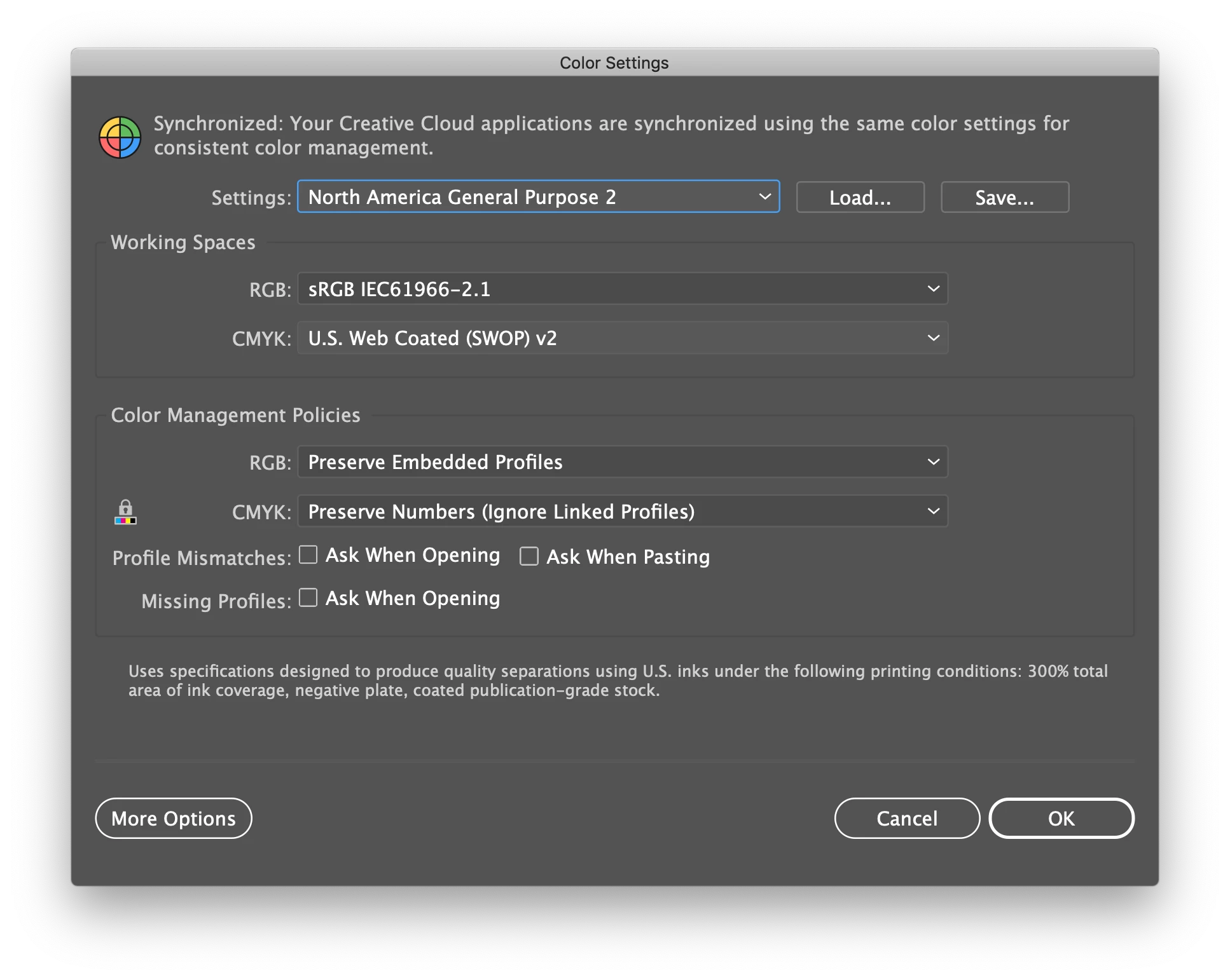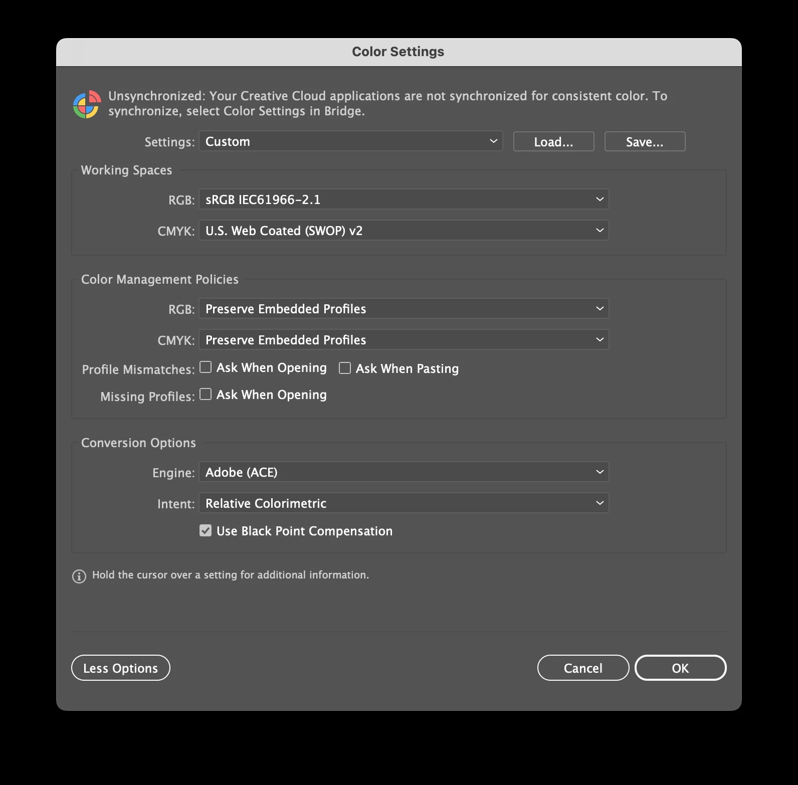 - Set "CMYK" to "Preserve Embedded Profiles".