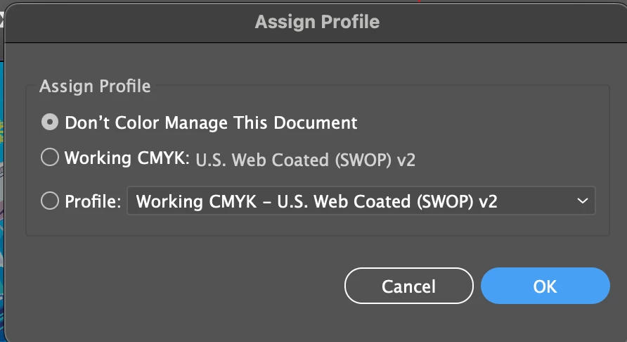 - The warning will appear ("WARNING: Your current color settings honor CMYK profiles in linked content but profiles were set to be ignored when this document was created.").